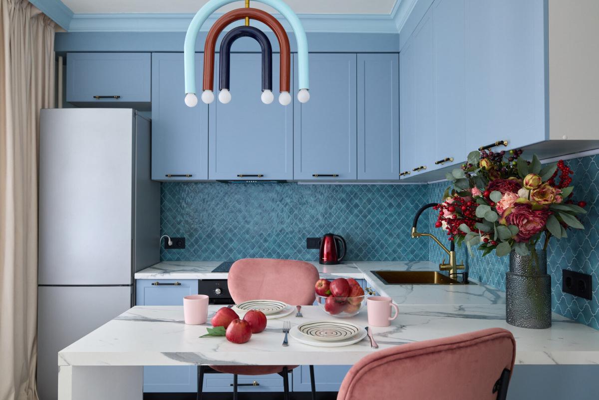 Кухня в бирюзовых тонах представлена стильным и современным дизайном. Основные элементы включают бирюзовую плитку на фартуке, которая добавляет объём и текстуру. Верхние шкафы выполнены в светло-голубом оттенке, создавая ощущение простора и свежести. Подвесная лампа с элементами в нескольких цветах добавляет яркий акцент.